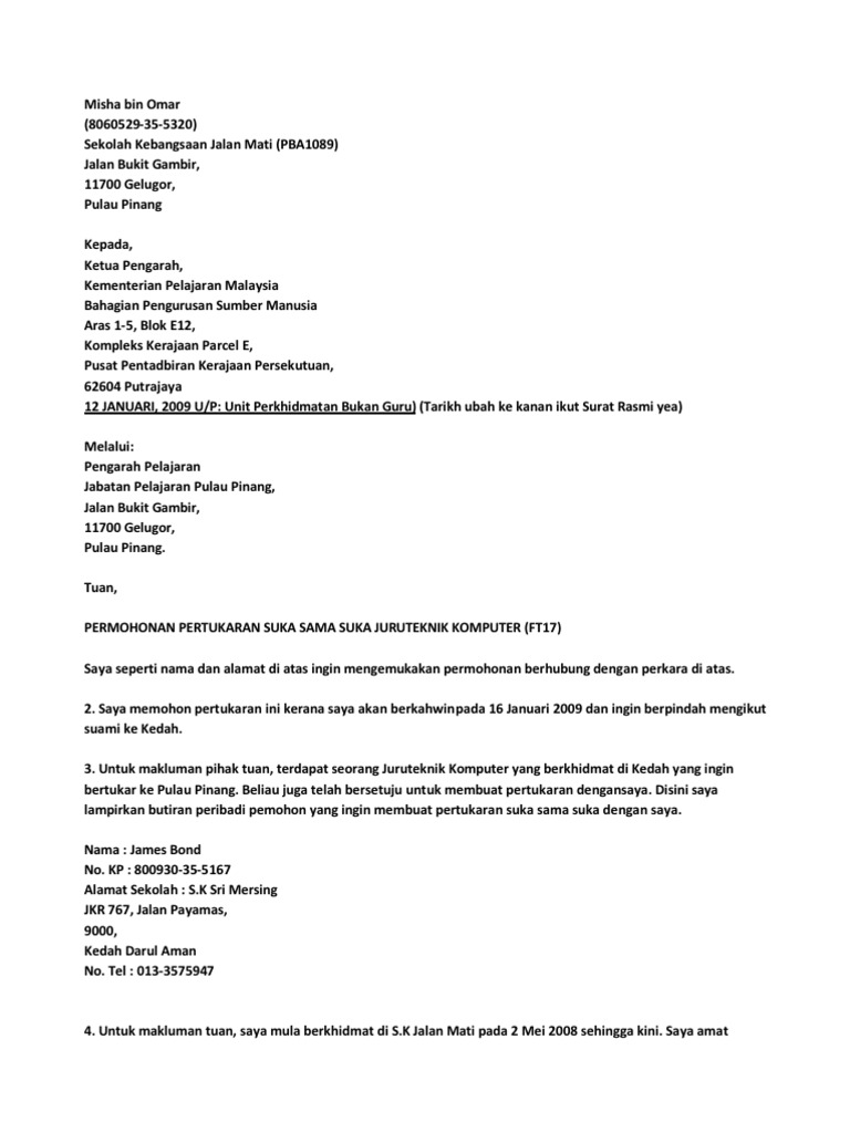 Contoh Surat Permohonan Pertukaran Hospital My Ponny M from imgv2-2-f.scribdassets.com Namun, tidak menutup kemungkinan dengan alasan. Pastikan anda memberikan alasan yang kukuh untuk membuat pertukaran di cawangan, jabatan atau negeri yang lain. Contoh surat permohonan pertukaran ke jabatan lain. Ada contoh surat pernyataan kesanggupan, surat pernyataan kerja, surat pernyataan menikah, surat pernyataan sikap, dan lain sebagainya. Resepi ayam panggang chef sabri. Djatmiko suherman, s.e nip : Emel kepada pengurus sumber manusia atau hantar sendiri. Related posts to contoh surat rayuan pertukaran guru dalam negeri.