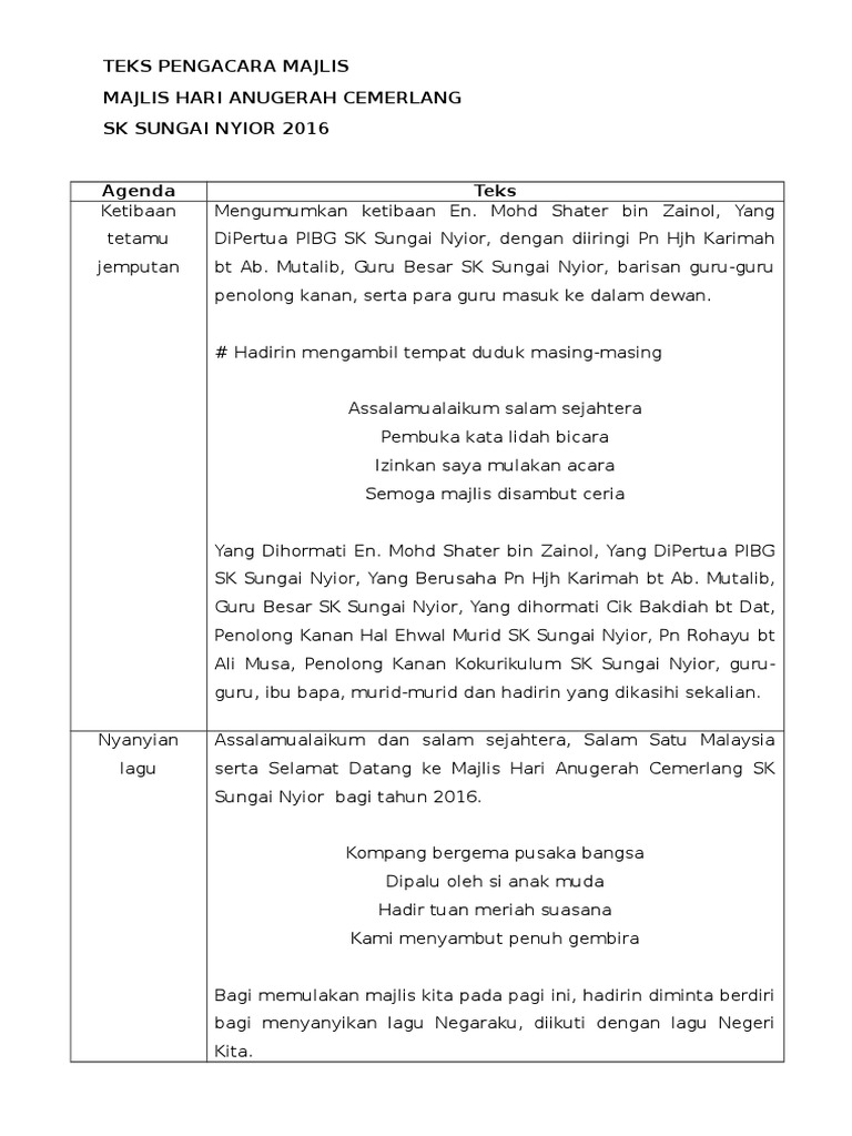 Majlis merakamkan jutaan terima kasih kepada pn xxxxxxx & pn xxxxxxi atas segala penerangan dan pengetahuan baru yang dikongsikan bersama kita skrip pengacara hari anugerah kecemerlangan. Teks pengacara majlis perpisahan en. Hadirin sekalian, lebat kemiri pohonnya rendah rendah dahan terikat tali perkasa sepuluh jari kami menadah mohon berkat. Masuk ke perkarangan majlis, para hadirin diminta untuk berdiri. Majlis anugerah cemerlang 2017 smkevii.