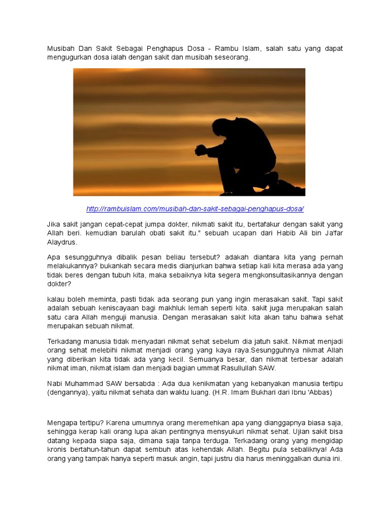 Ketika Aku Sakit from muslimkecil.com Namun, sifat allah yang maha pemaaf membuat kita harus segera bertaubat dan melakukan amalan penghapus dosa kecil maupun besar. Sakit dan musibah merupakan penghapus dosa. Sampaipun hal sakit kecil semisal tertusuk duri, maka allah akan gugurkan dosanya, apalagi sakit yang berat. Umrah yang satu dengan umrah berikutnya adalah sebagai penghapus dosa di antara keduanya (h.r albukhari). Semua dosa pasti ada cara untuk menghapusnya sebagaimana penyakit pasti ada obatnya. Rasa capek, sakit, cemas, sedih, ataupun suatu gangguan, maupun gundah sehingga ia keluar dalam keadaan bersih dari dosa (kecil)(h.r muslim). Bukan hanya ini saja, banyak pasti kita timbul tanda tanya, apa hubungan penyakit dengan sedekah? Untuk penjagaan kesihatan otak si kecil.