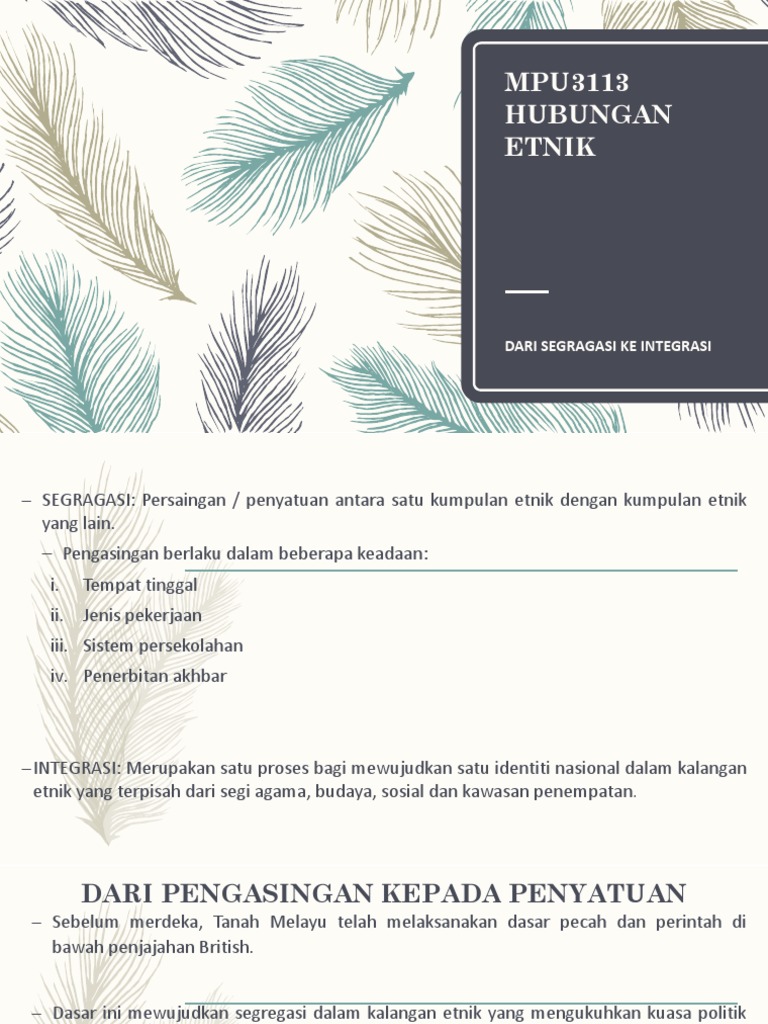 Hubungan Etnik Bab 7 from imgv2-1-f.scribdassets.com Persoalan hubungan etnik, perpaduan dan integrasi amat penting bagi mewujudkan kestabilan politik dan seterusnya pembangunan negara berjalan. Video ini membentangkan dasar pecah dan perintah di tanah melayu dan kesannya terhadap hubungan etnik oleh mahasiswa/i di university malaysia sabah untuk. Disebabkan oleh dasar pecah dan perintah yang diamalkan oleh british telah menyebabkan berlakunya rusuhan etnik di tanah melayu. Pemisahan fizikal ini wujud kesan daripada dasar 'pecah dan perintah' yang diamalkan oleh penjajah british pada masa dahulu. Perpaduan sepatutunya dipupuk sejak kecil lagi. Sebelum kita mengenali tentang hubungan pemerintah pusat dan daerah ada baiknya terlebih ini merupakan sebuah hubungan yang di dasari oleh konteks penyelenggaraan program pemerintah. Oleh hal demikian, adakah dasar pecah dan perintah oleh pihak inggeris akan menjadi penghalang kepada integrasi dalam kalangan masyarakat berbilang etnik di malaysia? Hubungan etnik yang mantap sangat perlu dalam kalangan rakyat sesebuah negara yg mempunyai kepelbagaian dari segi agama, bahasa, budaya dan etnik.