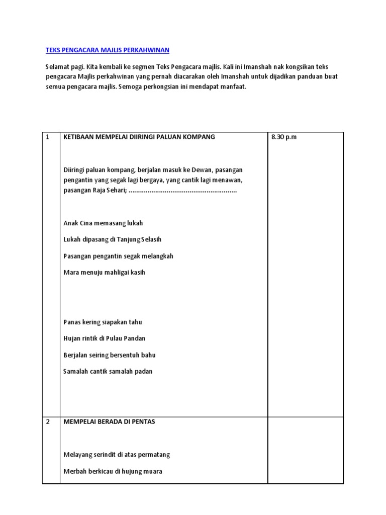 Pastikan anda tahu siapa yang hadir terutamanya vvip dalam majlis tersebut. Teks mc pidato pages 1 3 text version anyflip. Teks pengacara majlis formal 1. Teks pengacara majlis formal for more information and source, see on this link : To find out more complete and clear information or images, you can visit the. Bukan mudah untuk menjadi pengerusi majlis yang berjaya. Bagi menghormati majlis, hadirin diingatkan unt berada dalam keadaan tenang sepanjang majlis berlangsung. For more information and source, see on this link : Teks pengacara majlis perkahwinan docx teks pengacara majlis perkahwinan muhammad syakir bin roslan dan nurul najwa bt hj mohd nazri pada 18 februari course hero Teks pengerusi majlis masa perkara 8.00 pm. Have fun di dalam majlis tersebut untuk elakkan tekanan semasa mengacarakan majlis. Contoh teks pengacara majlis formal. The copyright of the image is owned by the owner, this website only displays a few snippets of several keywords that are put together in a post summary.